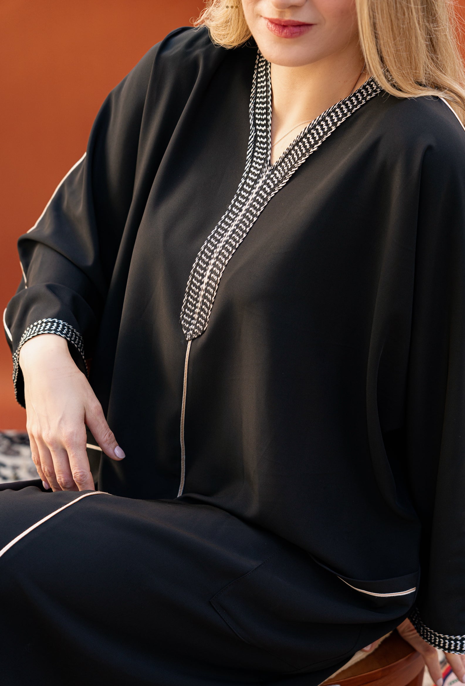 Djellaba à galon et poches pratiques, idéale pour un look à la fois raffiné et décontracté.