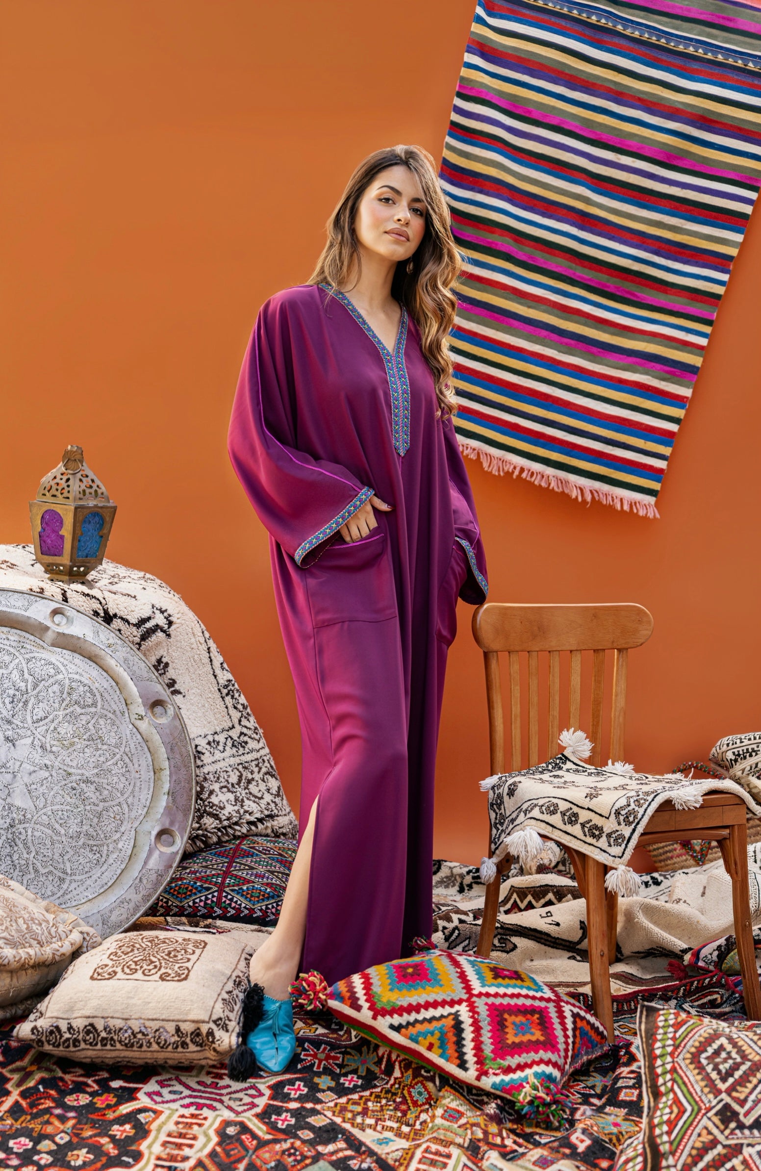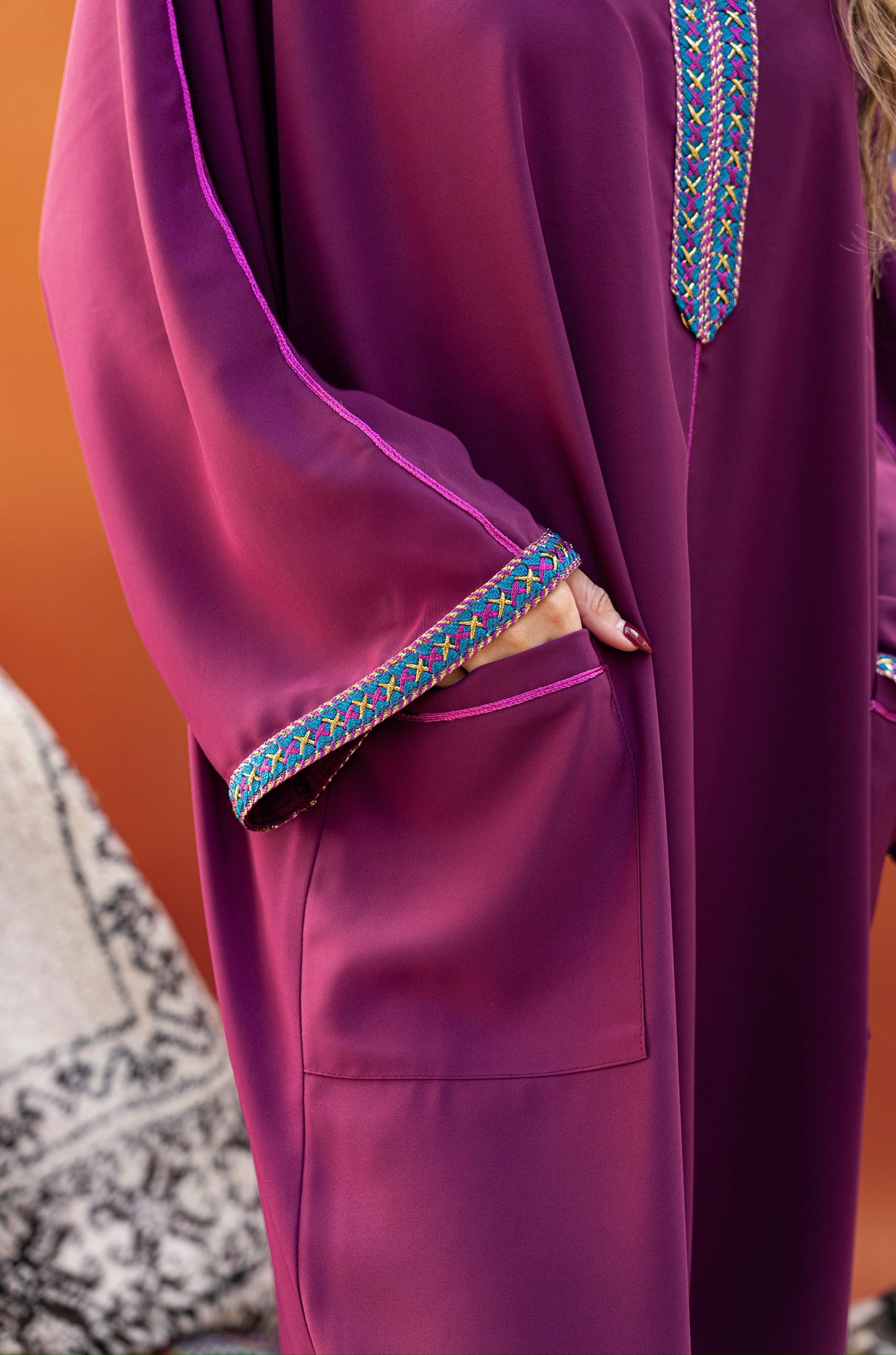 Djellaba à galon et poches pratiques, idéale pour un look à la fois raffiné et décontracté.