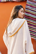 Djellaba en lin avec des poches plaquées et détails au niveau du col et poignets, fentes latérales et capuche.